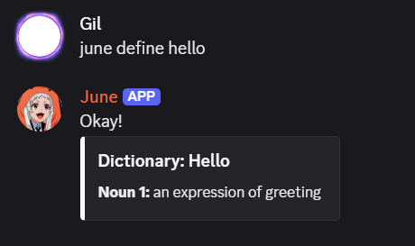 June's primary goal is user engagemenet. It's equipped with visual minigames like trivia, type-racer, charades and uno. It can also roll a dice, perform magic 8 ball, choose between things, predict odds and much more.