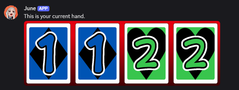 A player's hand is presented to them through direct messaging and updated by June in real time.