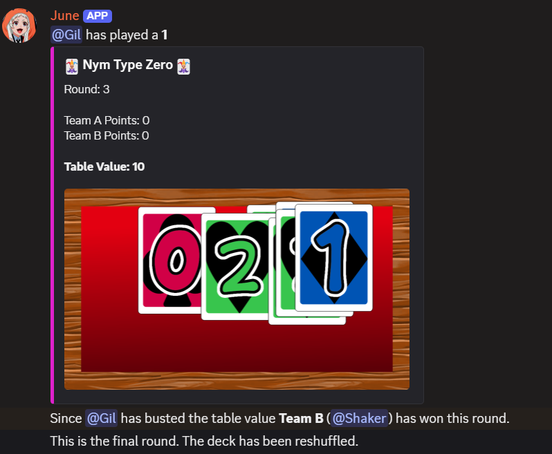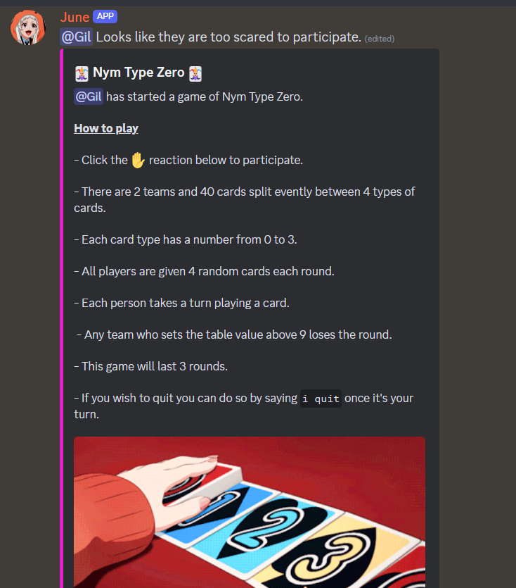 Users can launch a competitive instance of a multiplayer card game by typing j!nym into a channel.