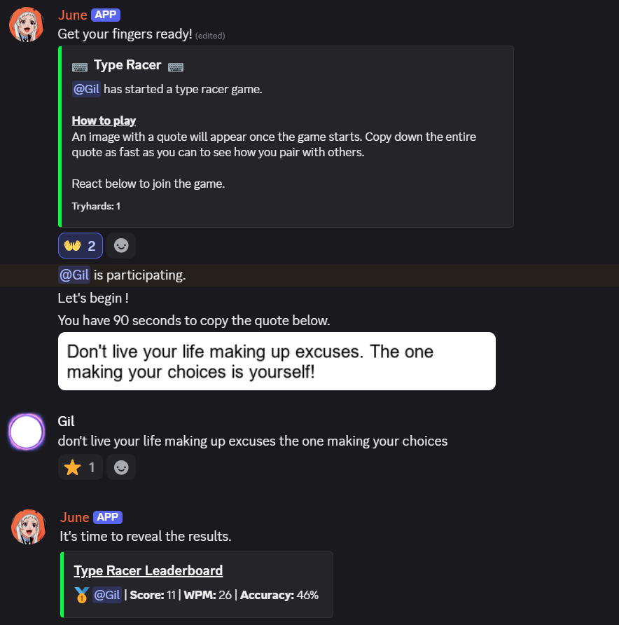 The j!type command starts a Type Racer–style minigame that anyone can join.