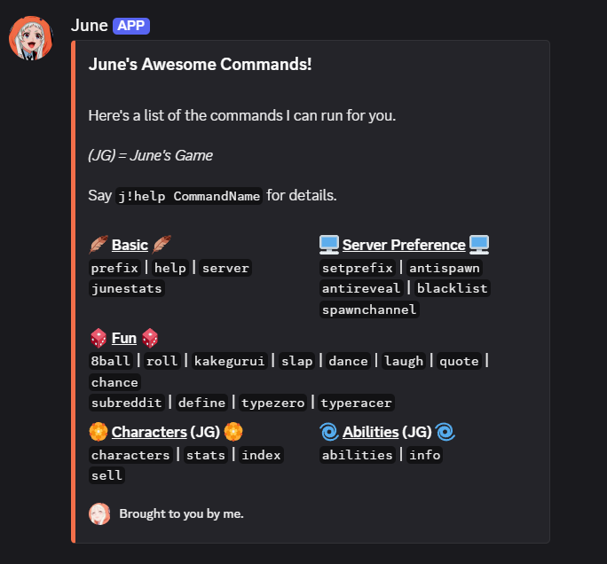 Likewise when a server administrator edits June's behavior to run in specific channels, disable commands or simply change it's prefix, this is also saved.