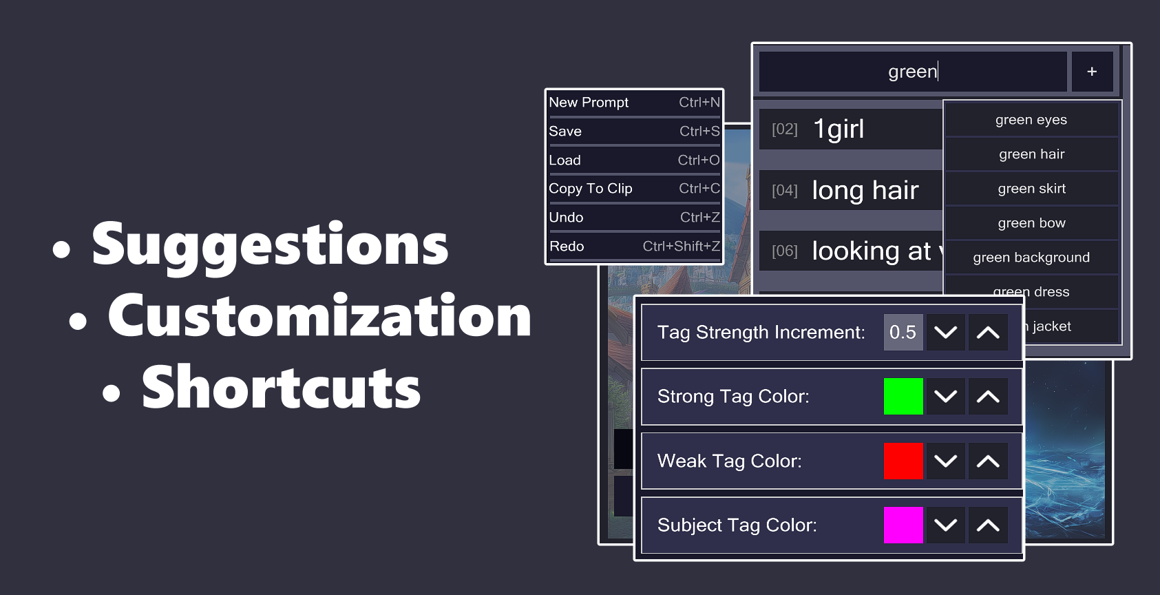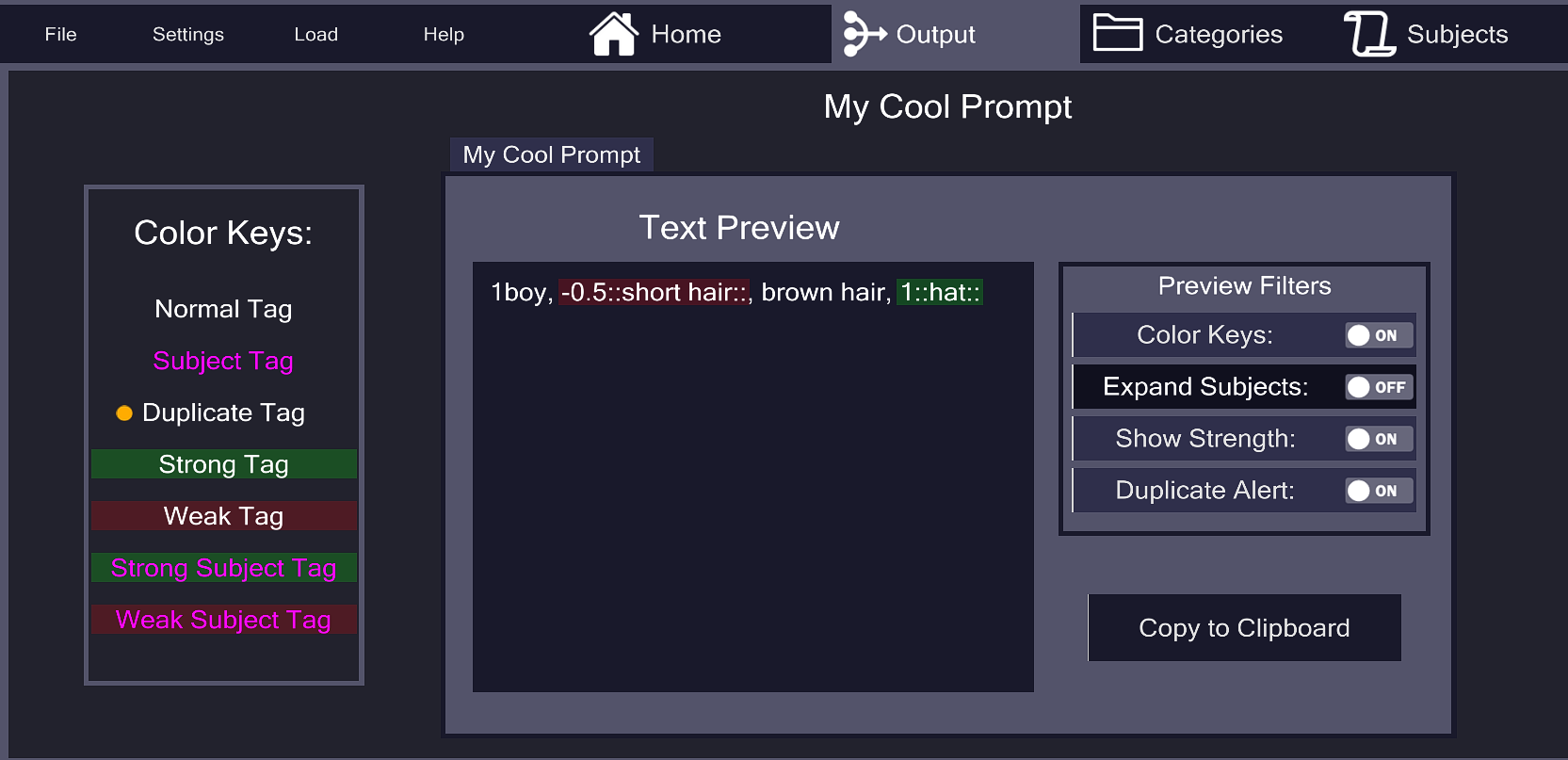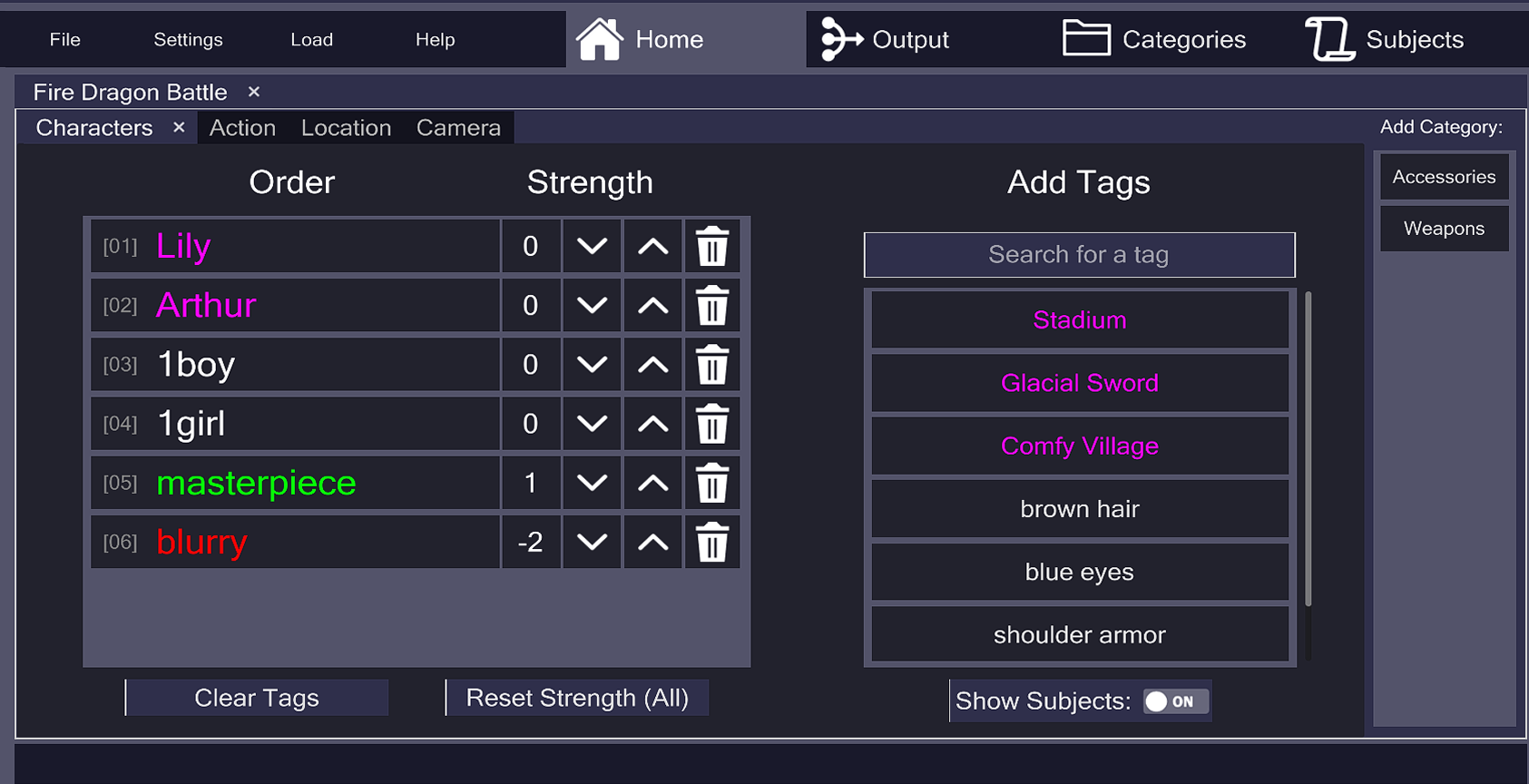 This offers a simple and intuitive to manipulate prompts, as all tags in one Category can be instantly removed and later re-added depending on the user's needs