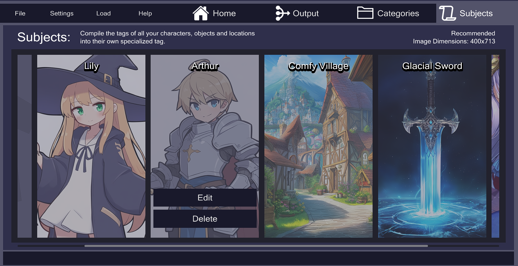 Whenever a subject tag is referenced in a prompt, it will include all the tags inside it as part of the final prompt. This feature vastly improves the readability of long wordy prompts.
