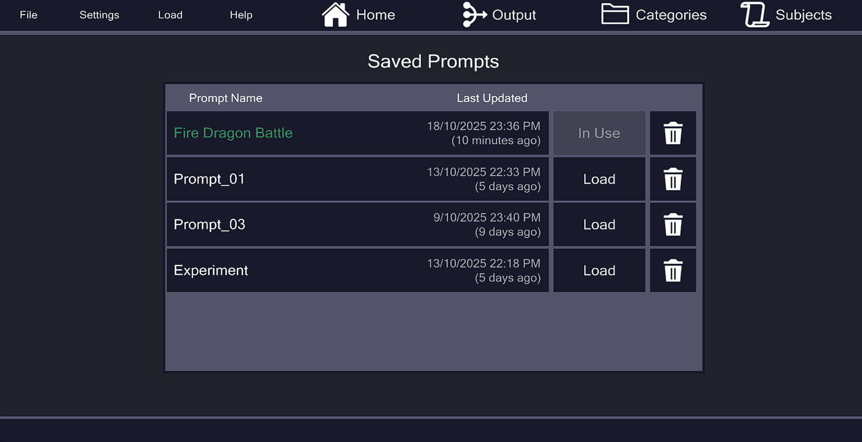 Categories and Subjects are saved separately from Prompts.